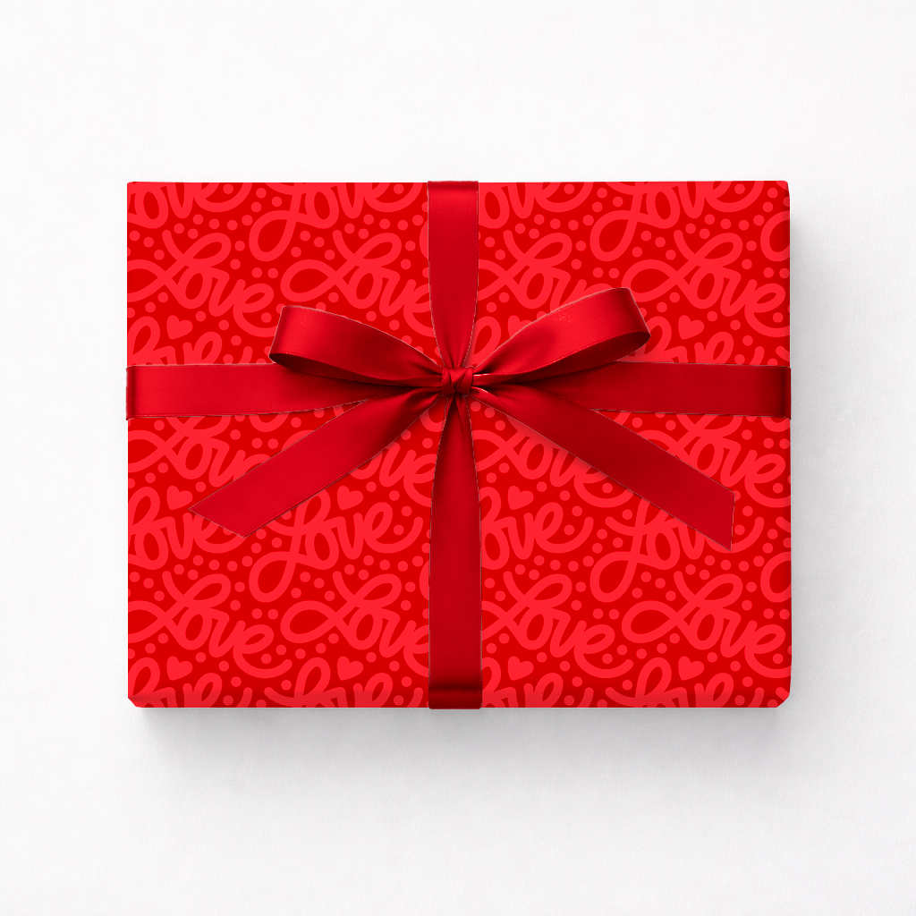 This illustrated wrapping paper features a repeating hand-drawn “love” script layered over a saturated red background. Bold, graphic, and playful without being precious, it’s designed to stand out before the gift is even opened.